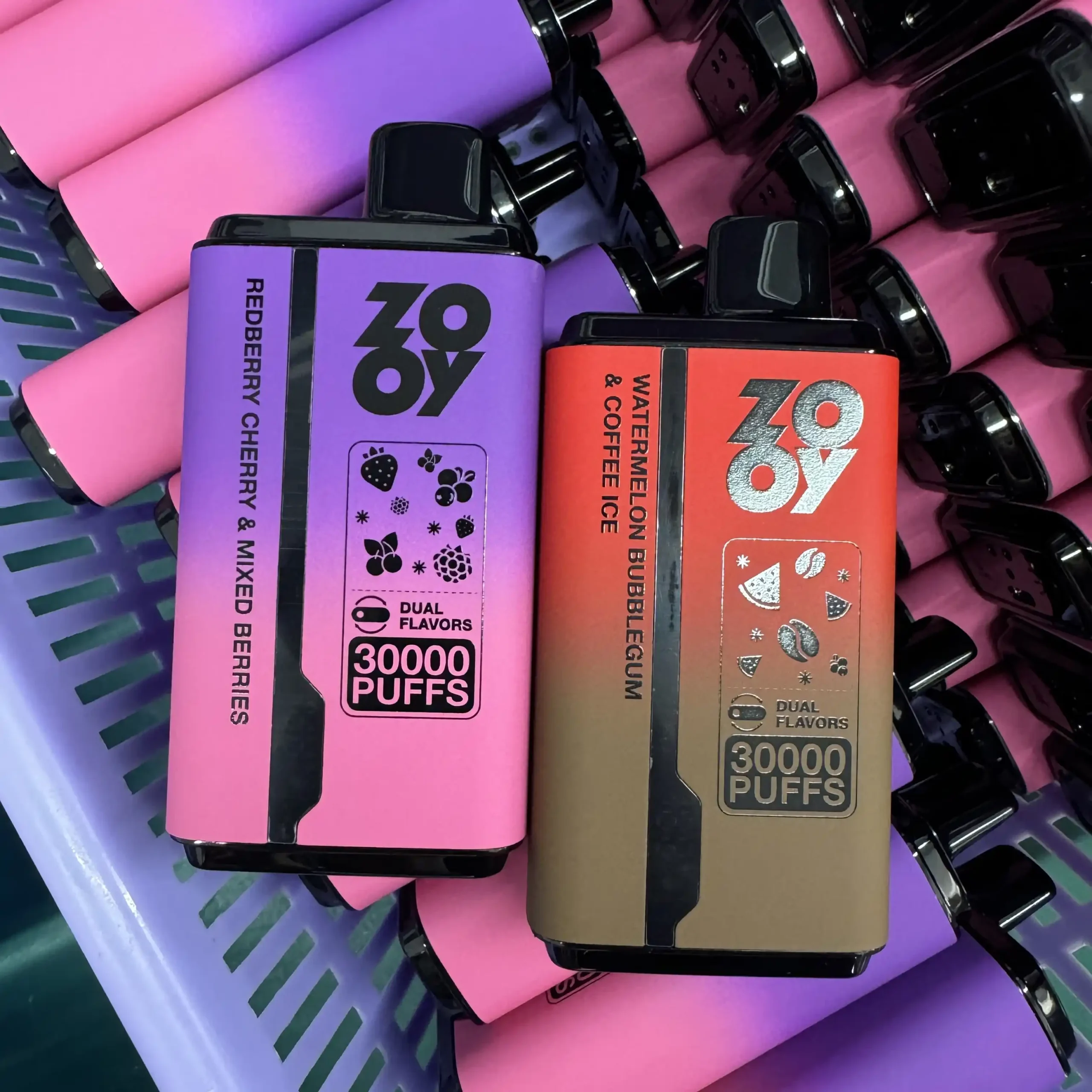 The ZOOY Twins 30000 Puffs offers dual flavor free switching, 20mg, 30mg, and 50mg nicotine salt, and double mesh coils for enhanced flavor, with options like Watermelon Bubblegum & Coffee Ice and Strawberry Ice Cream & Peach Mango Milkshake